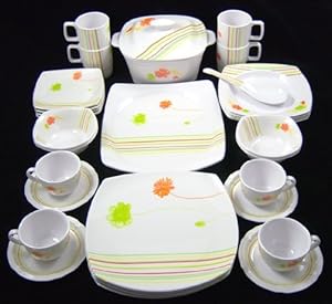 Set includes the following: 4 X 10.5" Square Dinner Plates, 4 X 6.5" Square Dessert Plates, 4 X 8" Square Soup Plates, 1 X 12" Rectangular Serving Plate, 4 X 6" Square Cereal Bowls, 1 x 10" Square Casserole Bowl with Cover, 4 X 5oz (150ml) Tea Cups + 4 x 5.5" Round Saucers, 4 X 10.5oz (300ml) Mugs, 1 x Serving Spoon (Rice Scoop)